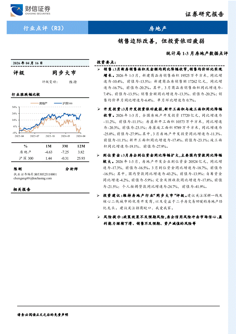 房地产行业:财信证券-房地产行业统计局1~3月房地产数据点评:销售边际改善,但投资依旧疲弱-260416