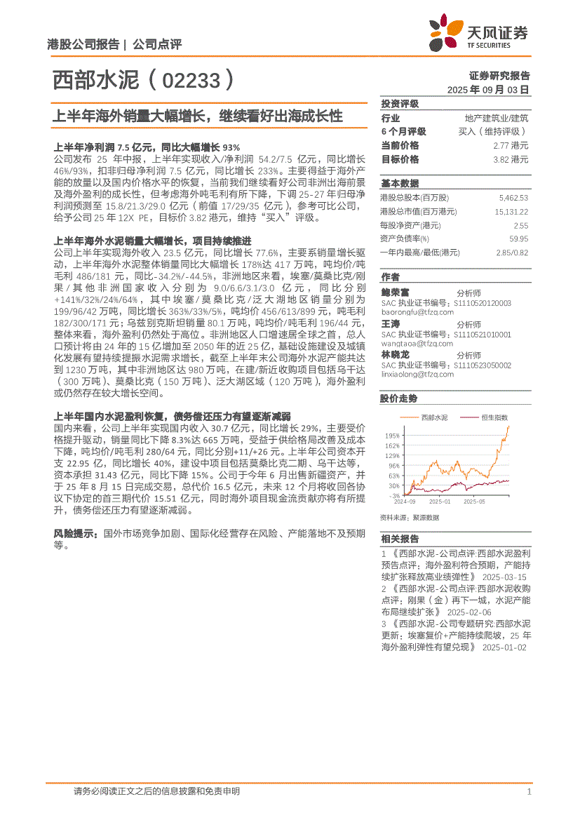 西部水泥:天风证券-西部水泥-2233.HK-上半年海外销量大幅增长,继续看好出海成长性-250903