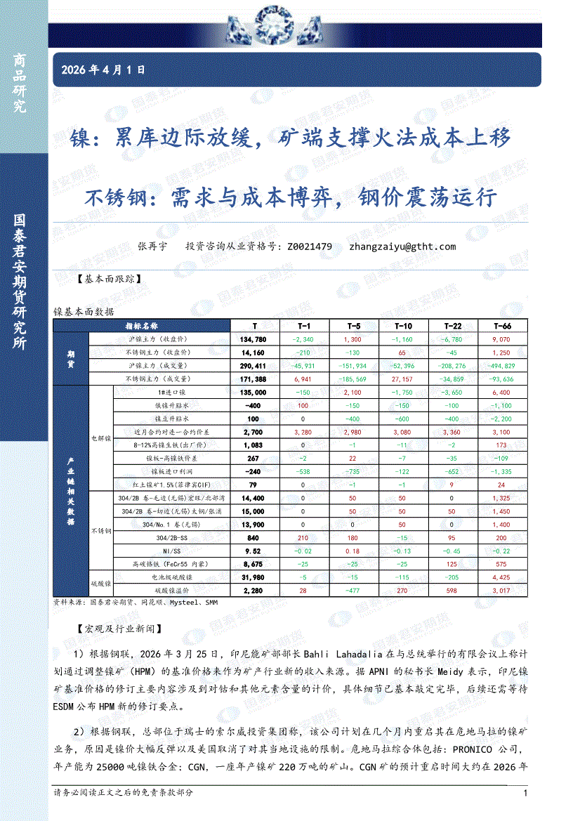 国泰君安期货-镍:累库边际放缓,矿端支撑火法成本上移,不锈钢,需求与成本博弈,钢价震荡运行-260401