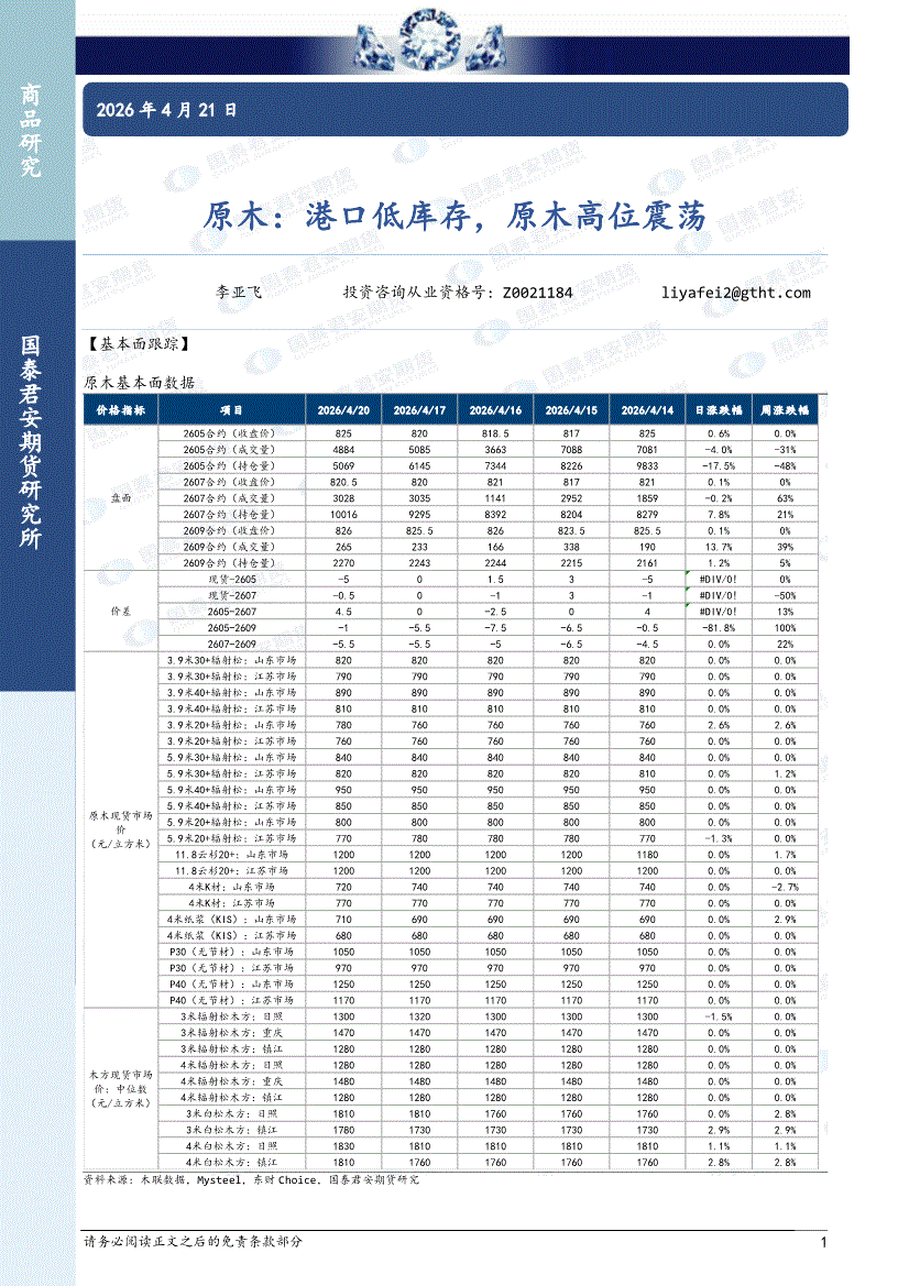 国泰君安期货-原木:港口低库存,原木高位震荡-260421