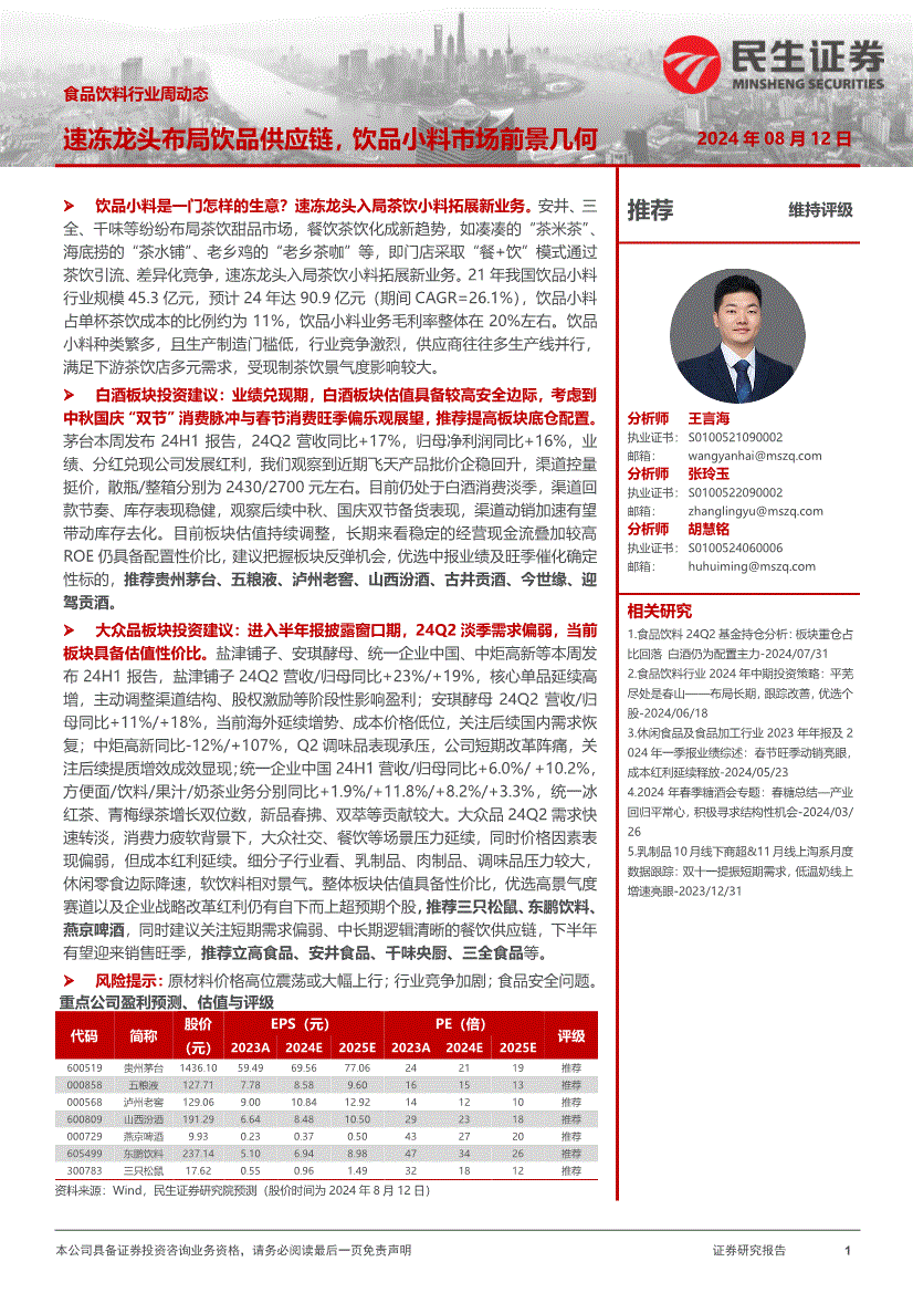 食品饮料行业:民生证券-食品饮料行业周动态:速冻龙头布局饮品供应链,饮品小料市场前景几何-240812