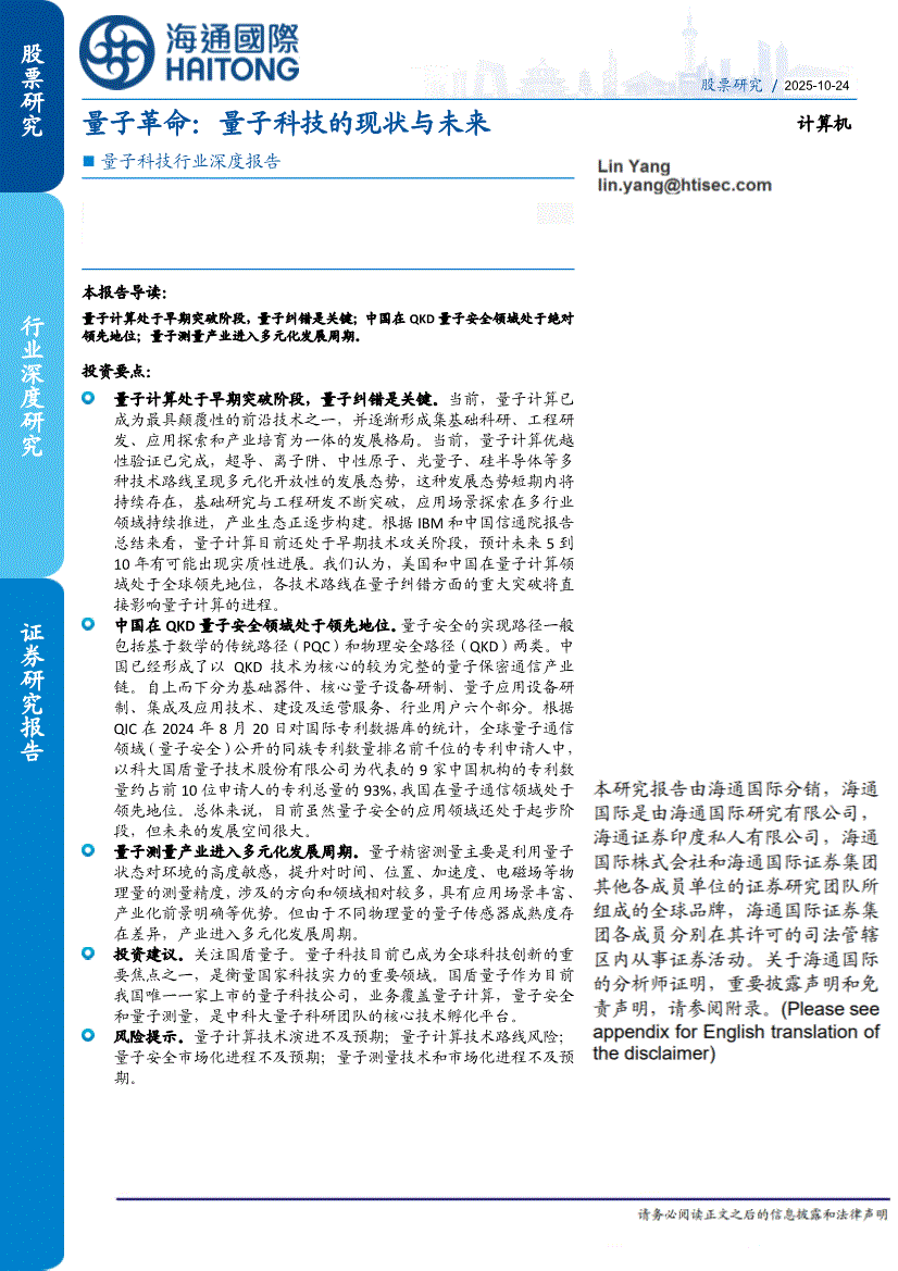 计算机行业:海通国际-量子科技行业深度报告:量子革命,量子科技的现状与未来-251024