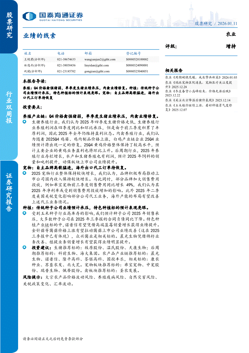 农业:国泰海通证券-农业双周报:业绩的线索-260111