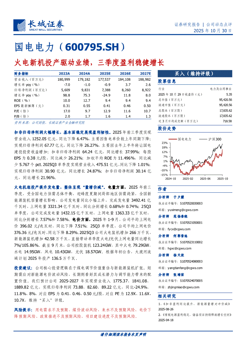 国电电力:长城证券-国电电力-600795-火电新机投产驱动业绩,三季度盈利稳健增长-251030