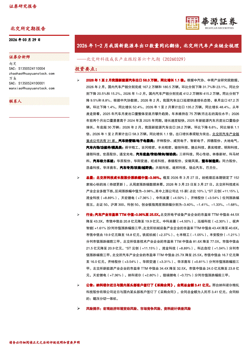 华源证券-北交所科技成长产业跟踪第六十九期:2026年1~2月我国新能源车出口数量同比翻倍,北交所汽车产业链全梳理-260329