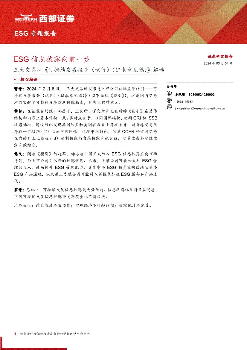 西部证券-三大交易所《可持续发展报告(试行)(征求意见稿)》解读:ESG信息披露向前一步-240304