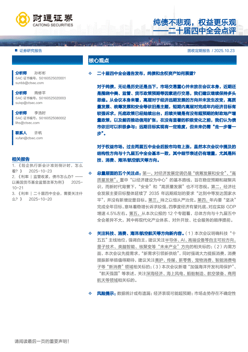 财通证券-二十届四中全会点评:纯债不悲观,权益更乐观-251023