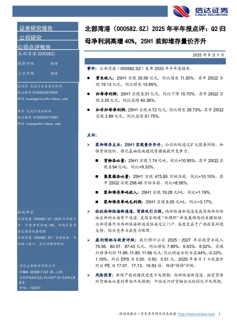 北部湾港:信达证券-北部湾港-000582-2025年半年报点评:Q2归母净利润高增40%,25H1装卸堆存量价齐升-250901
