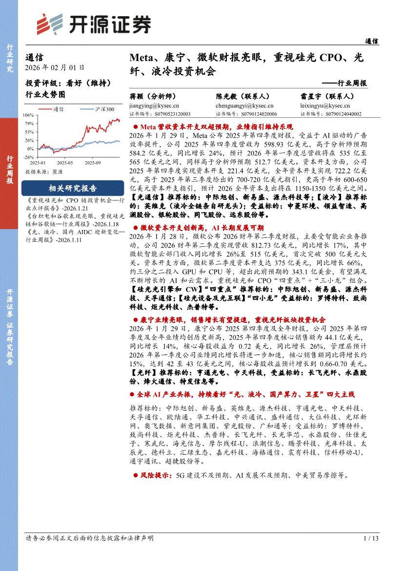通信行业:开源证券-通信行业周报:Meta、康宁、微软财报亮眼,重视硅光CPO、光纤、液冷投资机会-260201