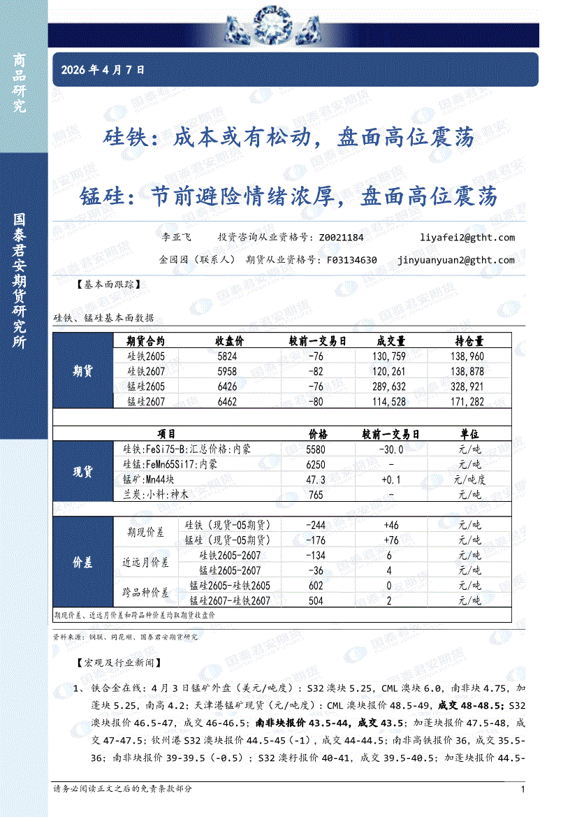 国泰君安期货-硅铁:成本或有松动,盘面高位震荡,锰硅,节前避险情绪浓厚,盘面高位震荡-260407