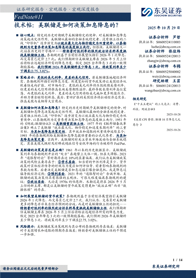 东吴证券-宏观深度报告:技术帖,美联储是如何决策加息降息的?-251029