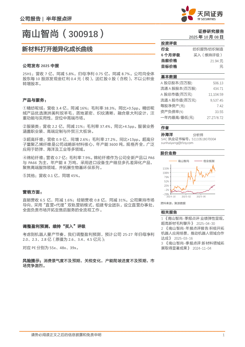 南山智尚:天风证券-南山智尚-300918-新材料打开差异化成长曲线-251008