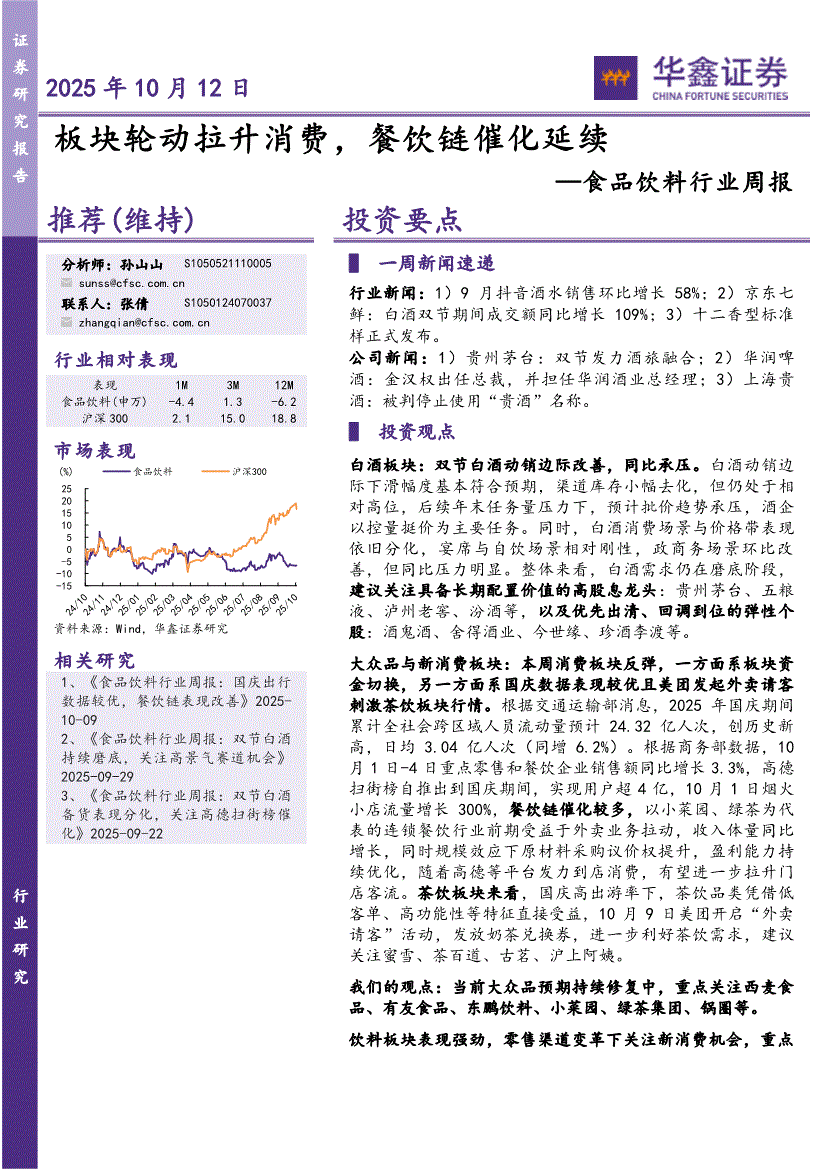 食品饮料行业:华鑫证券-食品饮料行业周报:板块轮动拉升消费,餐饮链催化延续-251012