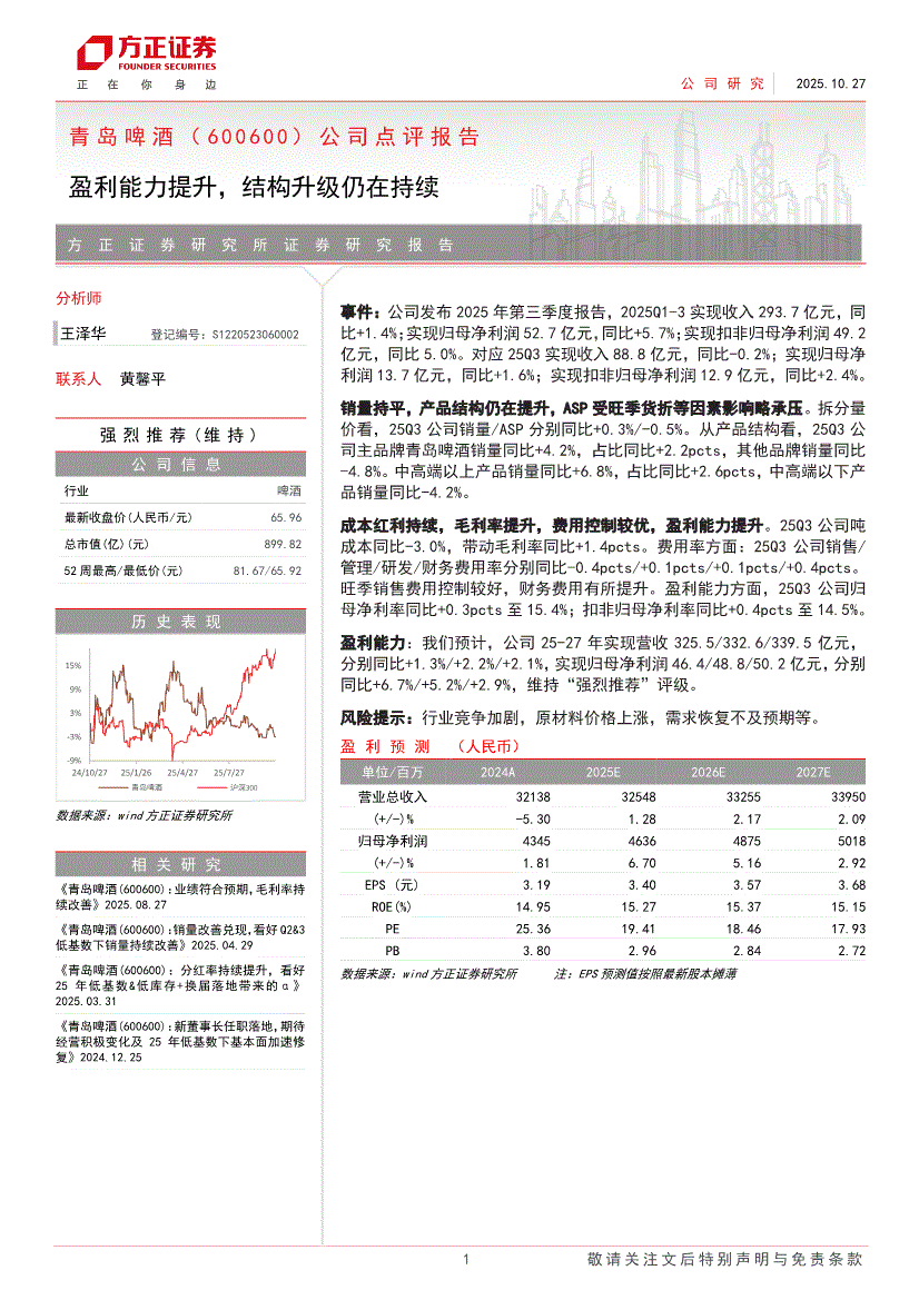 青岛啤酒:方正证券-青岛啤酒-600600-公司点评报告:盈利能力提升,结构升级仍在持续-251027