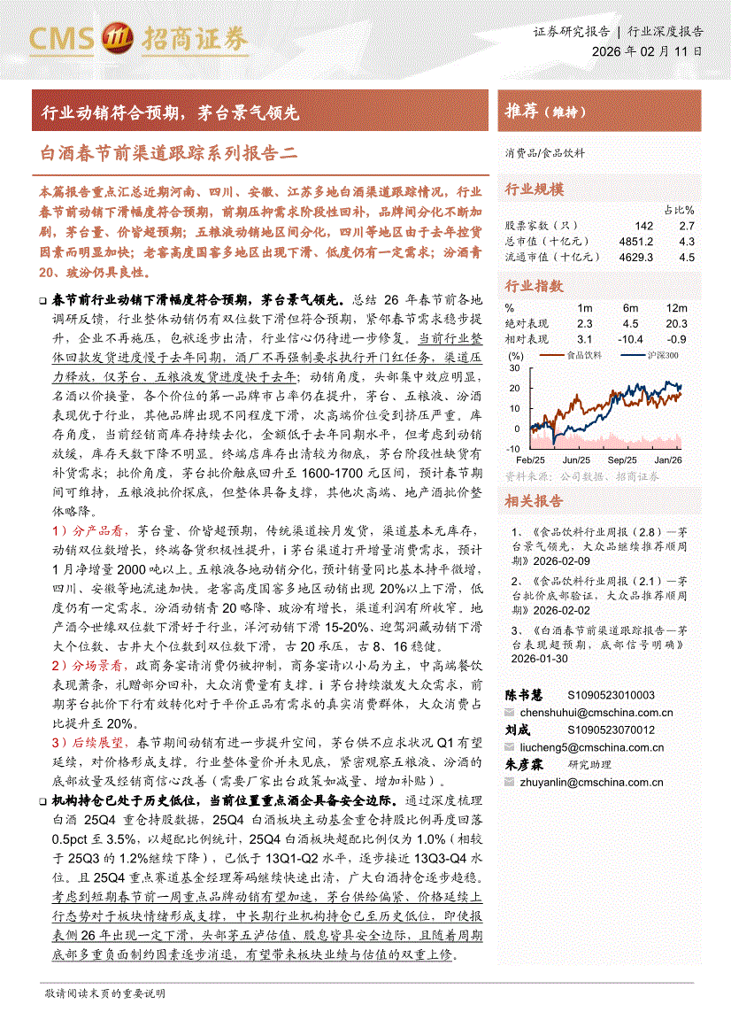 食品饮料行业:招商证券-食品饮料行业白酒春节前渠道跟踪系列报告二:行业动销符合预期,茅台景气领先-260211