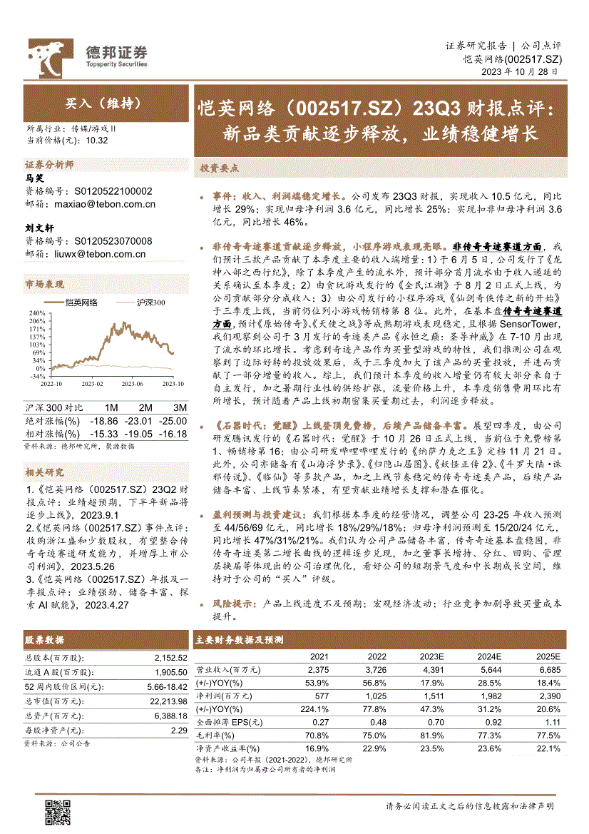 恺英网络:德邦证券-恺英网络-002517-23Q3财报点评:新品类贡献逐步释放,业绩稳健增长-231028