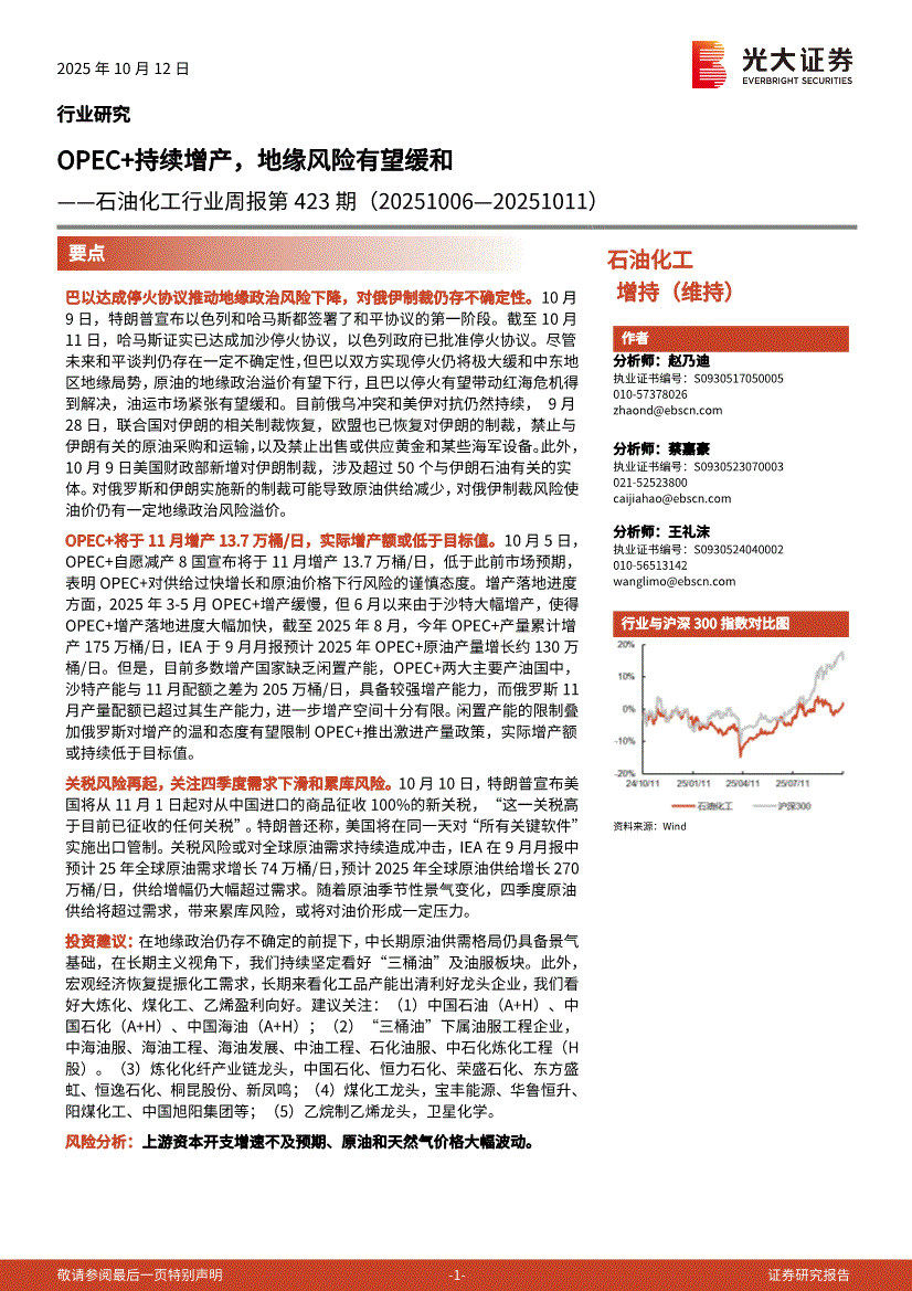 石油化工行业:光大证券-石油化工行业周报第423期:OPEC+持续增产,地缘风险有望缓和-251012