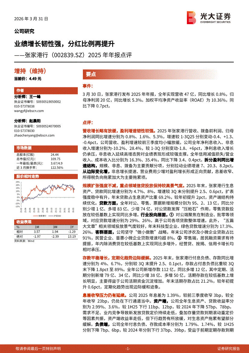 张家港行:光大证券-张家港行-002839-2025年年报点评:业绩增长韧性强,分红比例再提升-260331