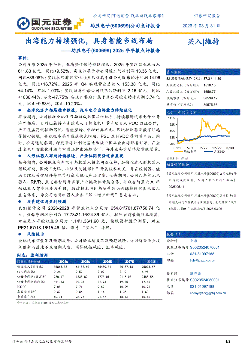均胜电子:国元证券-均胜电子-600699-2025年年报点评报告:出海能力持续强化,具身智能多线布局-260331
