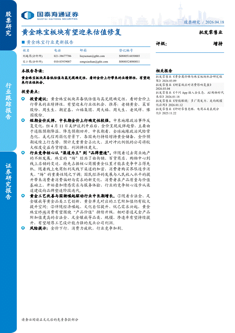 批发零售行业:国泰海通证券-黄金珠宝行业更新报告:黄金珠宝板块有望迎来估值修复-260418
