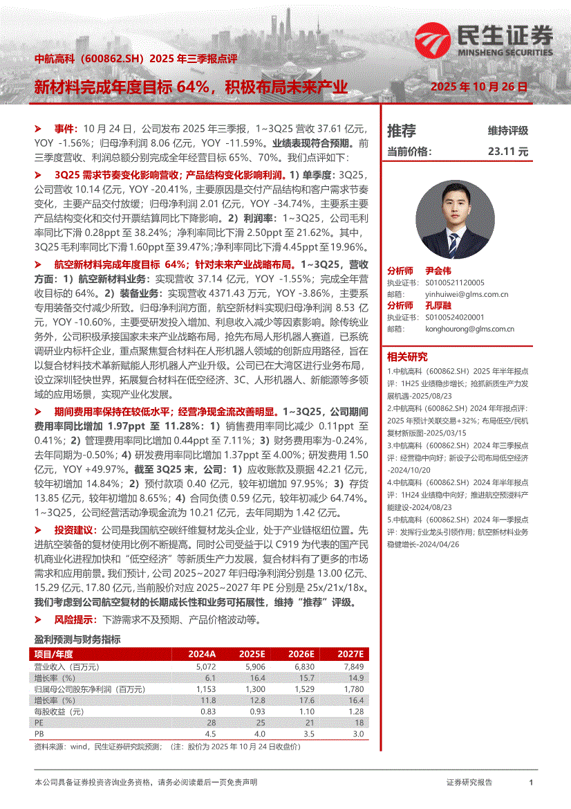 中航高科:民生证券-中航高科-600862-2025年三季报点评:新材料完成年度目标64%,积极布局未来产业-251026