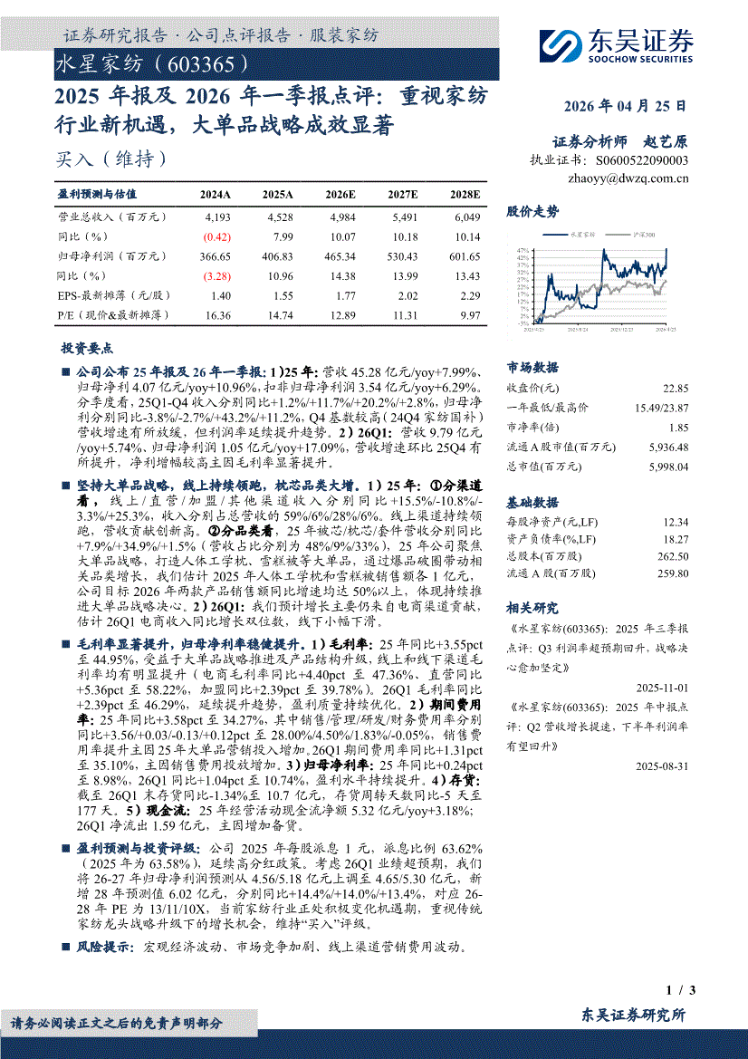 东吴证券-水星家纺-603365-2025年报及2026年一季报点评:重视家纺行业新机遇,大单品战略成效显著-260425