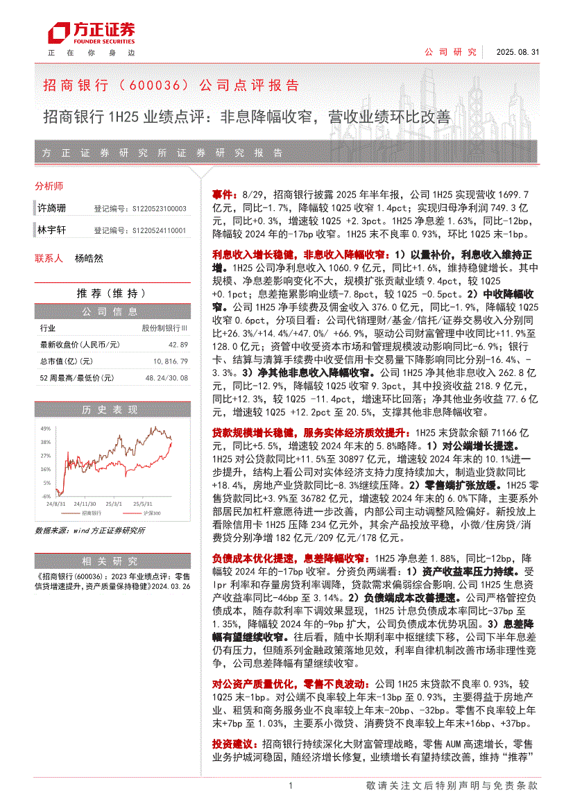 招商银行:方正证券-招商银行-600036-1H25业绩点评:非息降幅收窄,营收业绩环比改善-250831