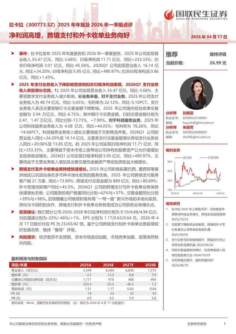 拉卡拉:国联民生证券-拉卡拉-300773-2025年年报及2026年一季报点评:净利润高增,跨境支付和外卡收单业务向好-260417