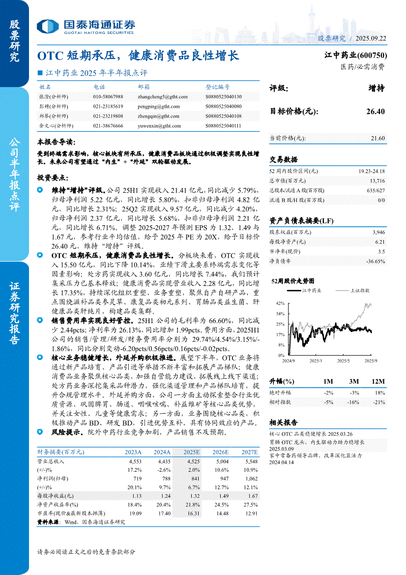 江中药业:国泰海通证券-江中药业-600750-2025年半年报点评:OTC短期承压,健康消费品良性增长-250922
