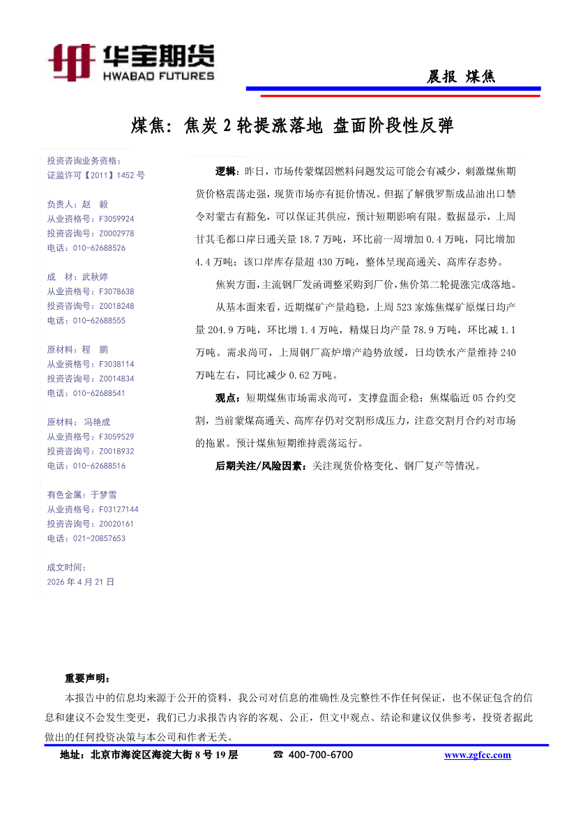 华宝期货-煤焦晨报:焦炭2轮提涨落地,盘面阶段性反弹-260421