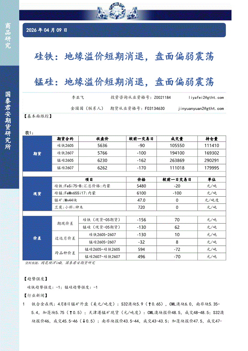 国泰君安期货-硅铁:地缘溢价短期消退,盘面偏弱震荡,锰硅,地缘溢价短期消退,盘面偏弱震荡-260409
