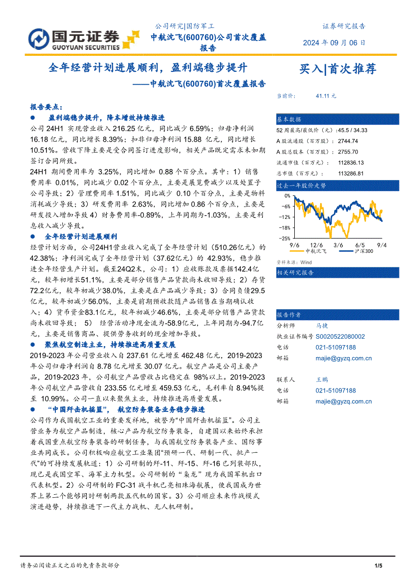中航沈飞:国元证券-中航沈飞-600760-首次覆盖报告:全年经营计划进展顺利,盈利端稳步提升-240906