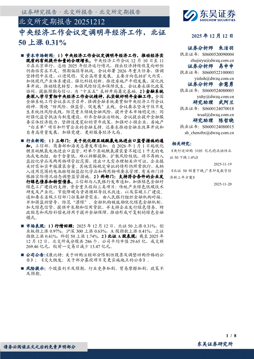 东吴证券-北交所定期报告:中央经济工作会议定调明年经济工作,北证50上涨0.31%-251212