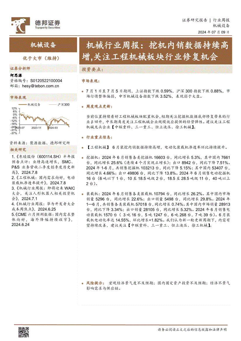 机械行业:德邦证券-机械行业周报:挖机内销数据持续高增,关注工程机械板块行业修复机会-240709