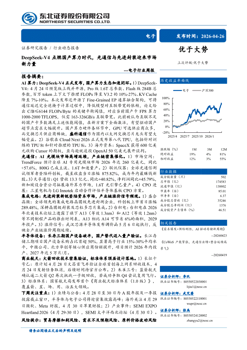 电子行业:东北证券-电子行业周报:DeepSeek~V4点燃国产算力时代,光通信与先进封装迎来市场新力量-260426