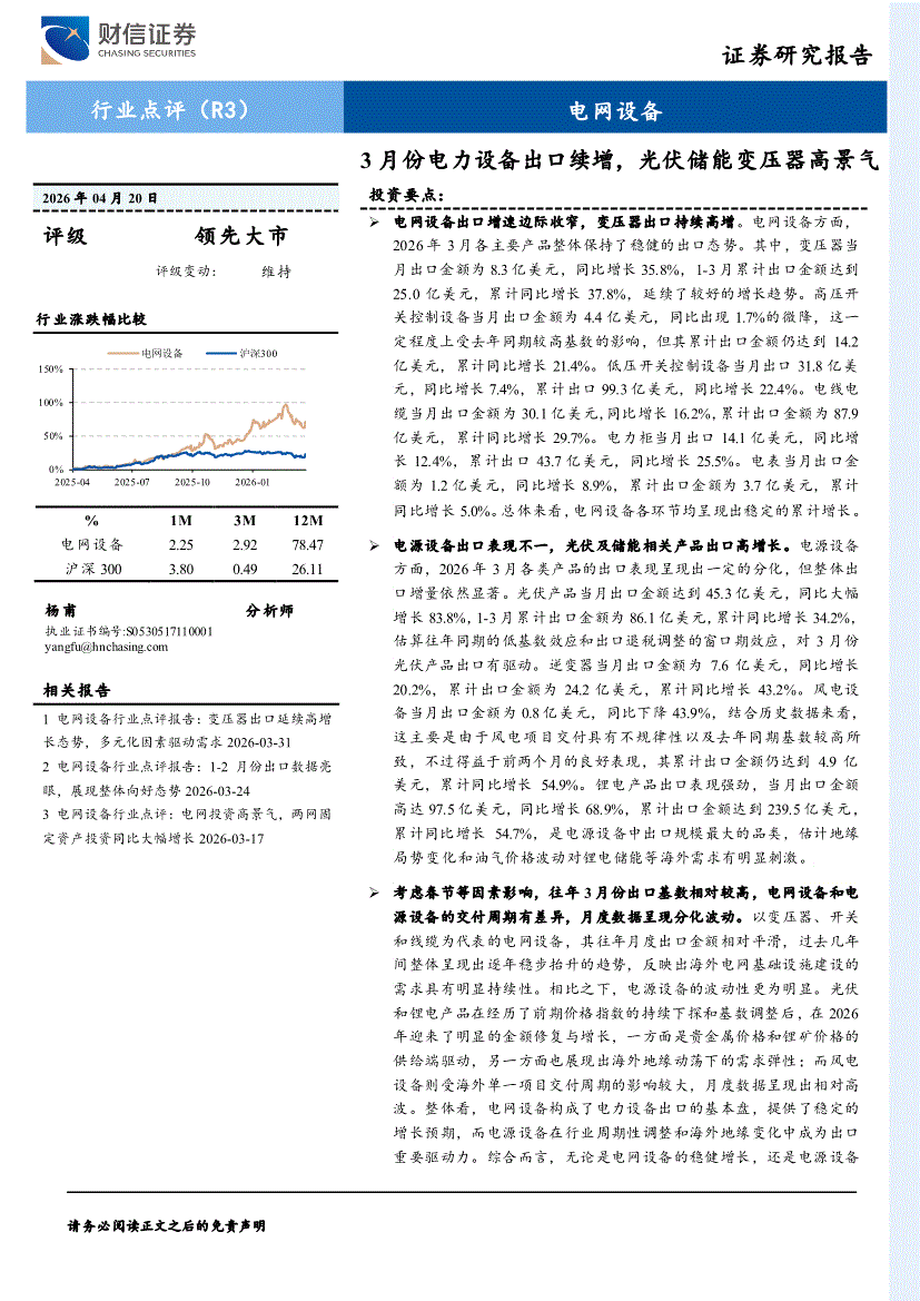 电网设备行业:财信证券-电网设备行业:3月份电力设备出口续增,光伏储能变压器高景气-260420
