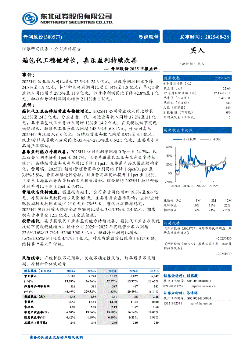 开润股份:东北证券-开润股份-300577-2025中报点评:箱包代工稳健增长,嘉乐盈利持续改善-250828