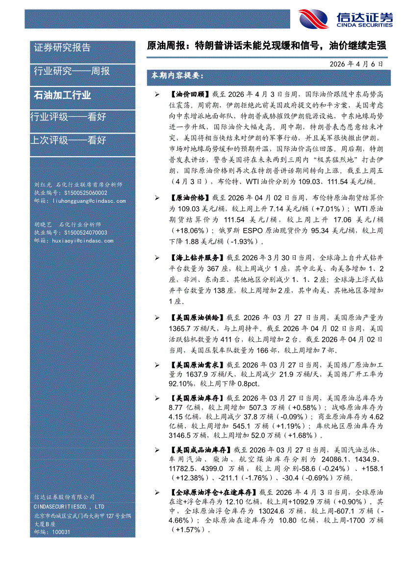 信达证券-石油加工行业原油周报:特朗普讲话未能兑现缓和信号,油价继续走强-260406