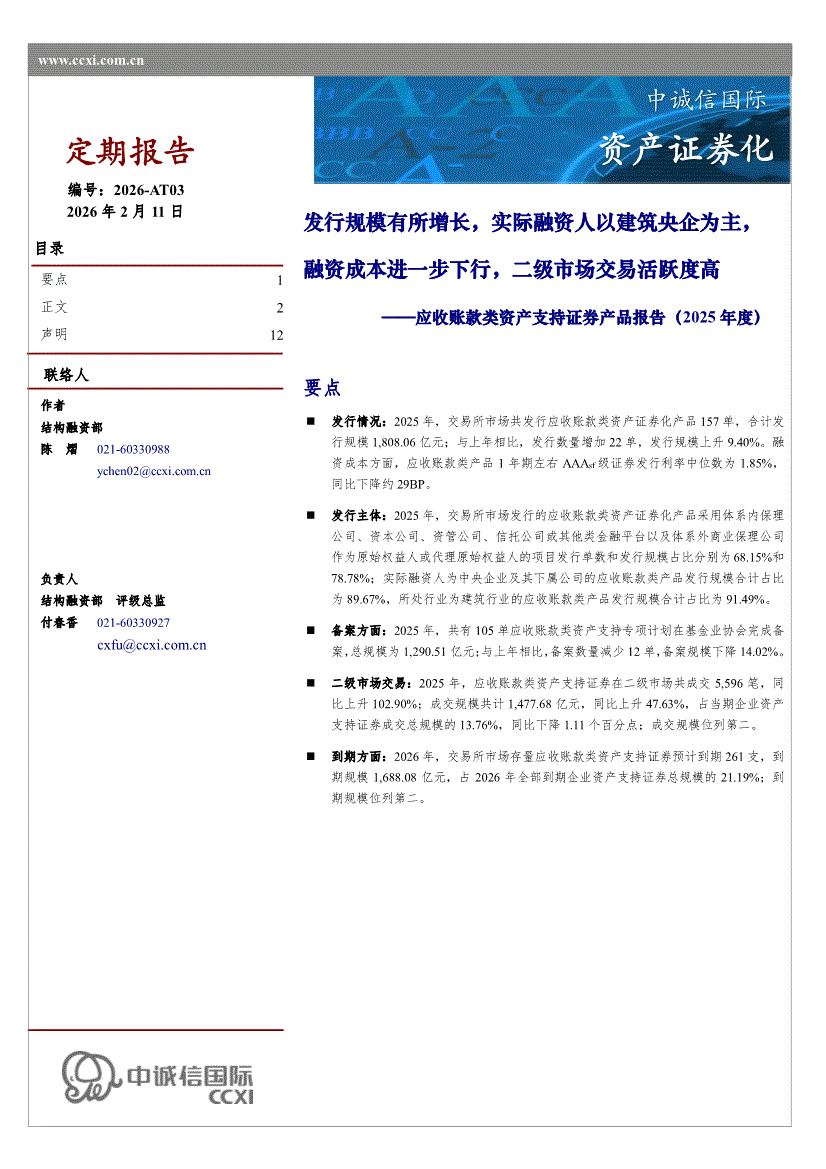 中诚信国际-应收账款类资产支持证券产品报告(2025年度):发行规模有所增长,实际融资人以建筑央企为主,融资成本进一步下行,二级市场交易活跃度高-260211