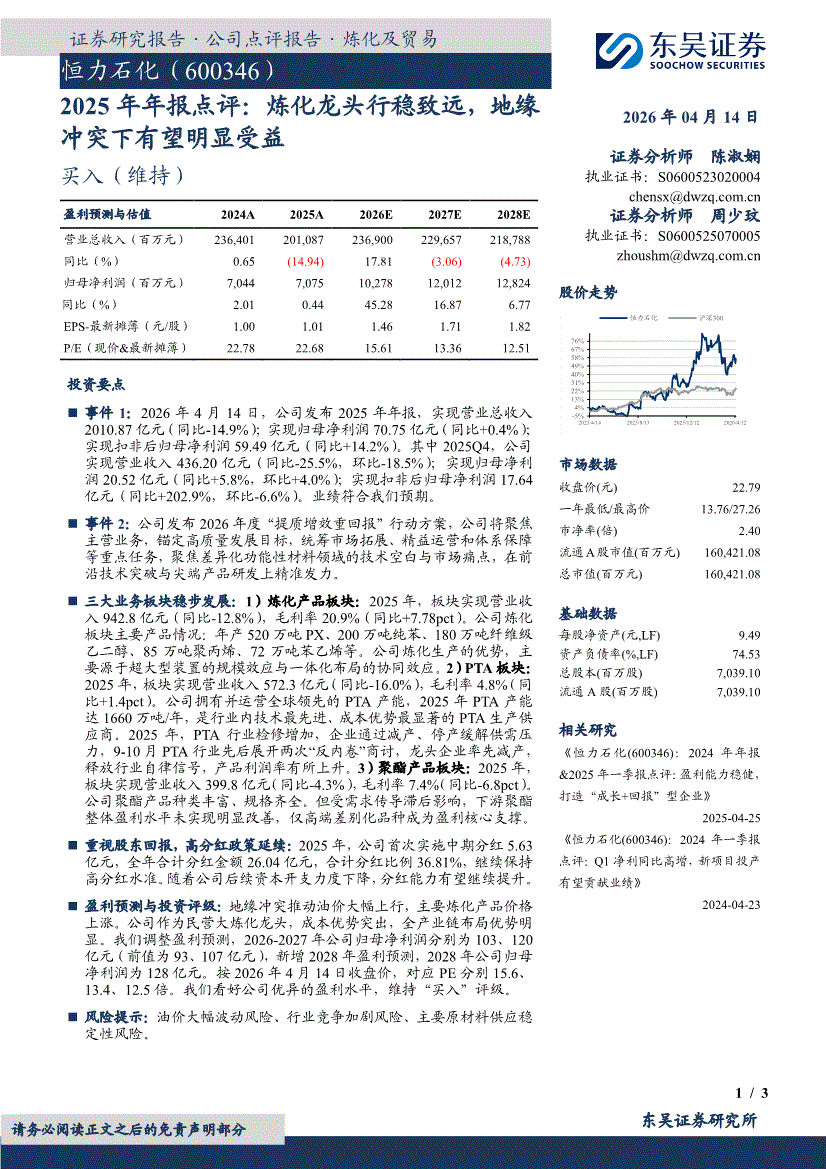 恒力石化:东吴证券-恒力石化-600346-2025年年报点评:炼化龙头行稳致远,地缘冲突下有望明显受益-260414
