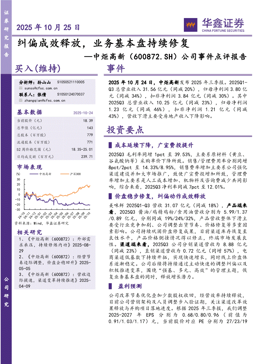中炬高新:华鑫证券-中炬高新-600872-公司事件点评报告:纠偏成效释放,业务基本盘持续修复-251025