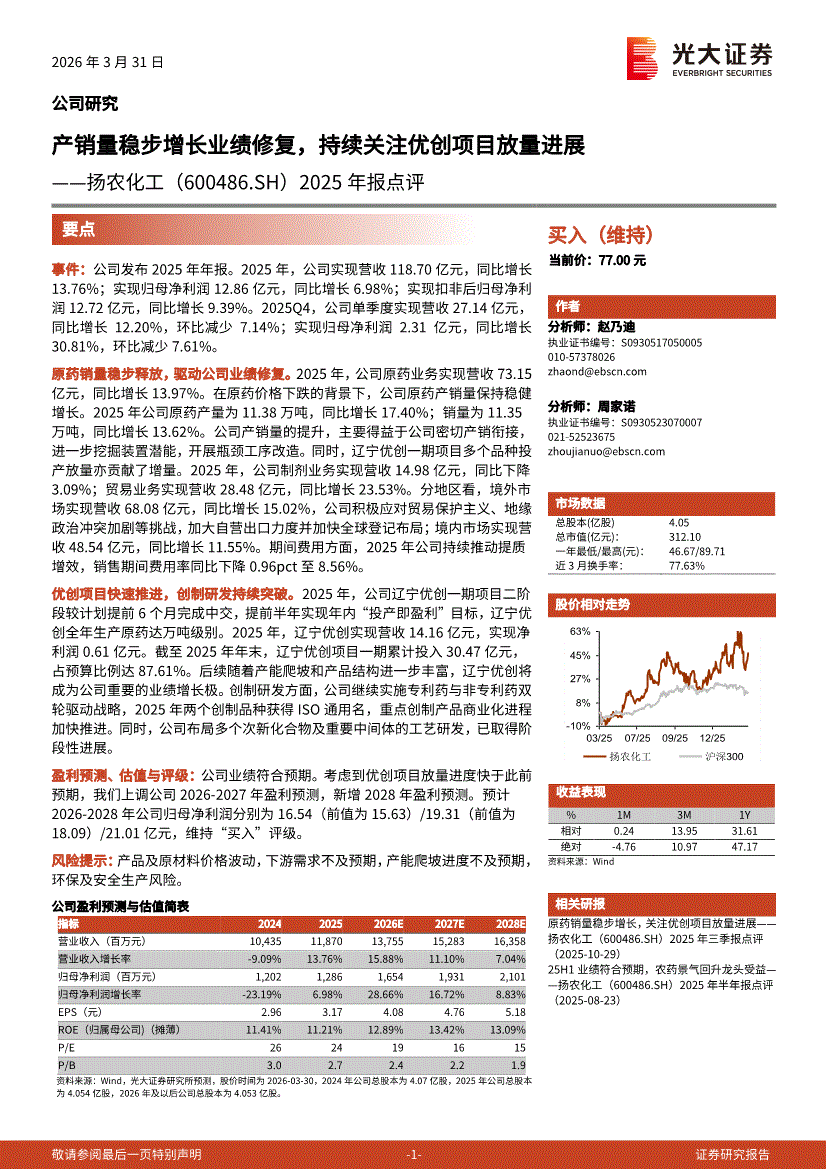 扬农化工:光大证券-扬农化工-600486-2025年报点评:产销量稳步增长业绩修复,持续关注优创项目放量进展-260331