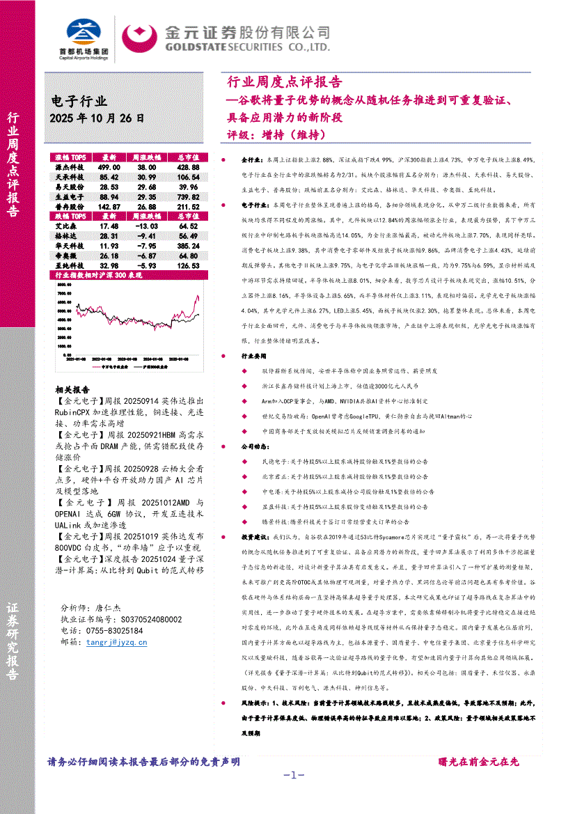 电子行业:金元证券-电子行业周度点评报告:谷歌将量子优势的概念从随机任务推进到可重复验证、具备应用潜力的新阶段-251026