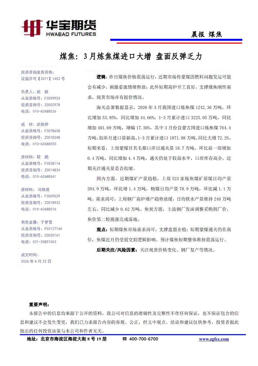 华宝期货-煤焦晨报:3月炼焦煤进口大增,盘面反弹乏力-260422
