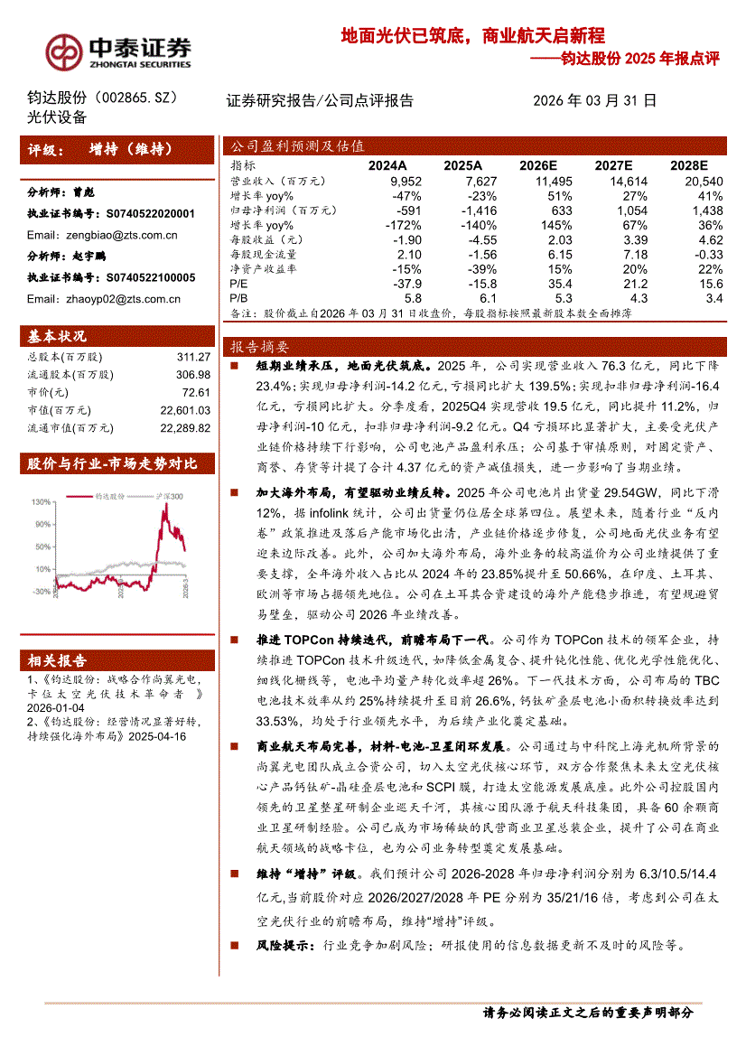 钧达股份:中泰证券-钧达股份-002865-2025年报点评:地面光伏已筑底,商业航天启新程-260331