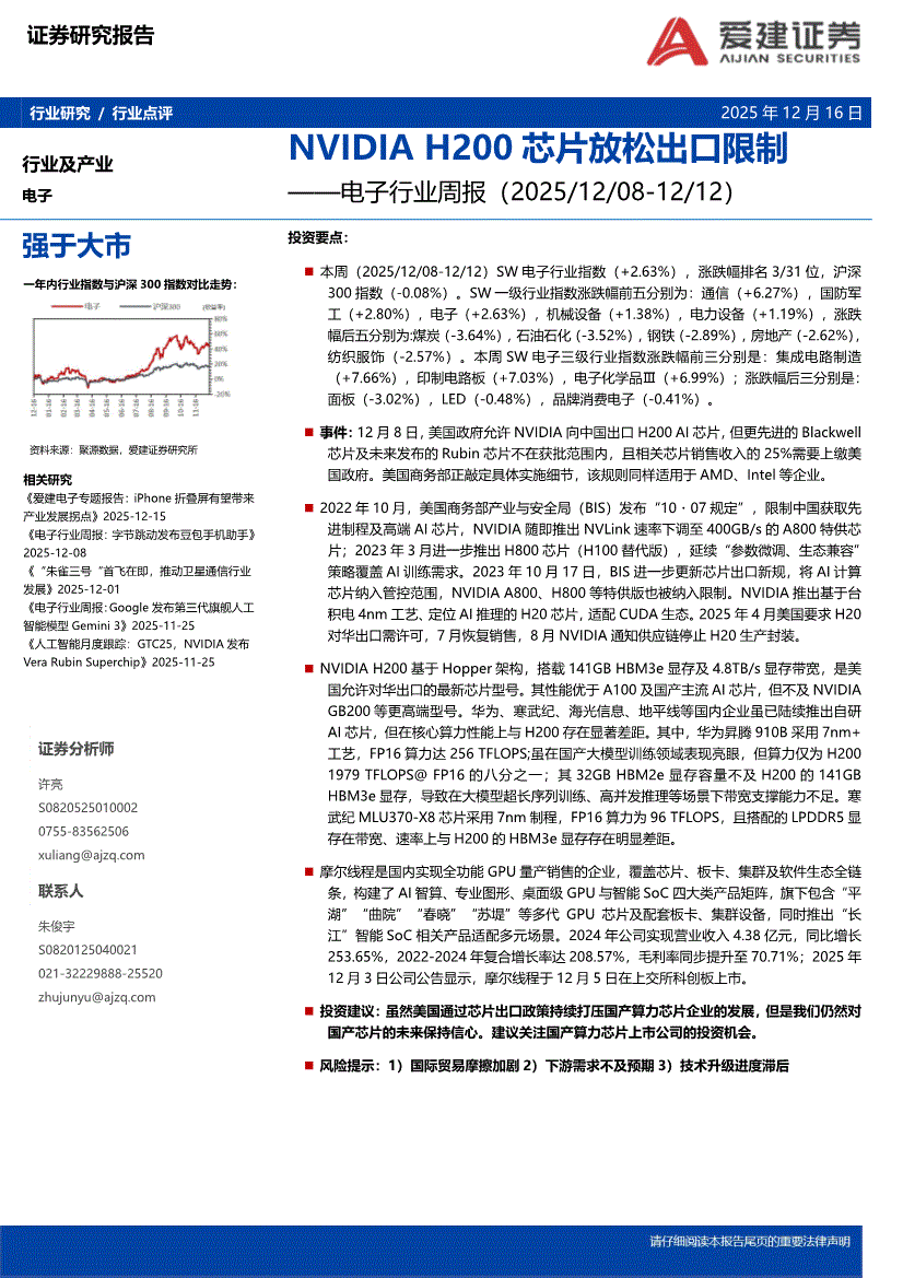 电子行业:爱建证券-电子行业周报:NVIDIA H200芯片放松出口限制-251216