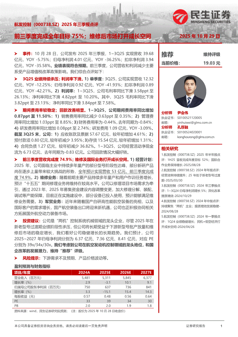 航发控制:民生证券-航发控制-000738-2025年三季报点评:前三季度完成全年目标75%;维修后市场打开成长空间-251029