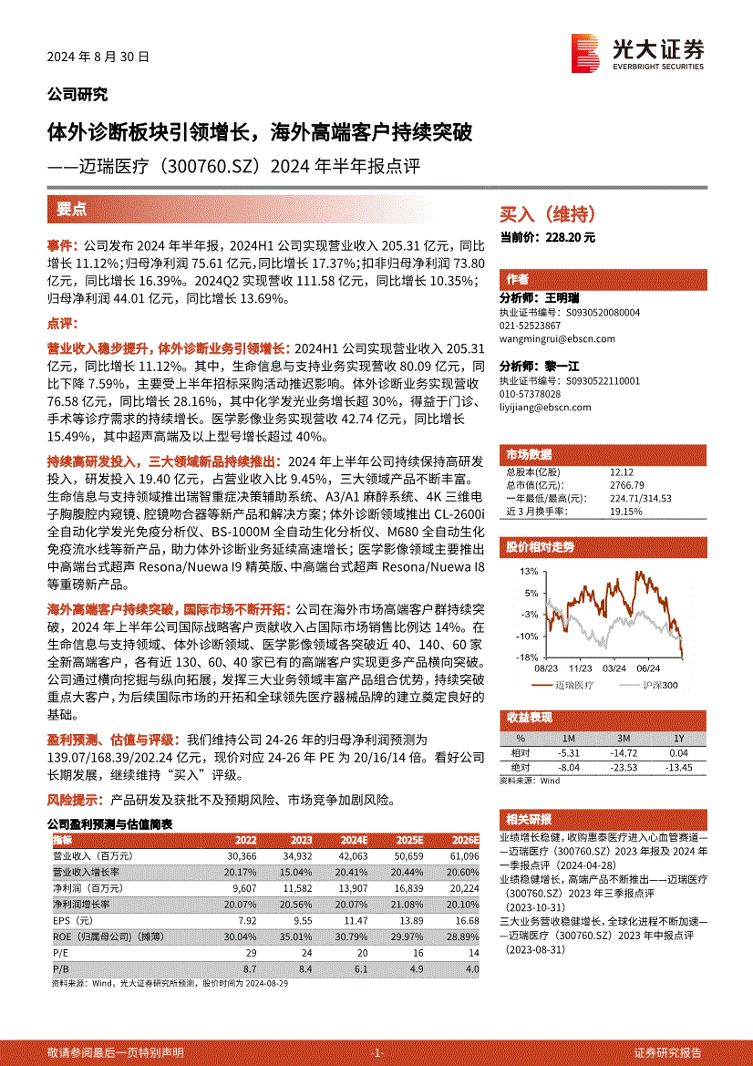迈瑞医疗:光大证券-迈瑞医疗-300760-2024年半年报点评:体外诊断板块引领增长,海外高端客户持续突破-240830