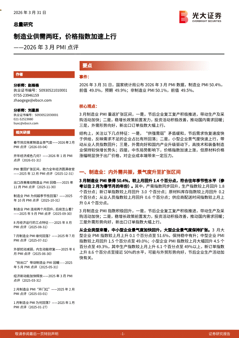 光大证券-2026年3月PMI点评:制造业供需两旺,价格指数加速上行-260331