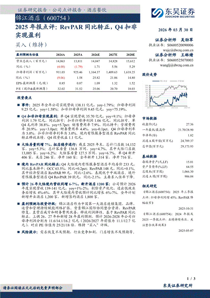 锦江酒店:东吴证券-锦江酒店-600754-2025年报点评:RevPAR同比转正,Q4扣非实现盈利-260330